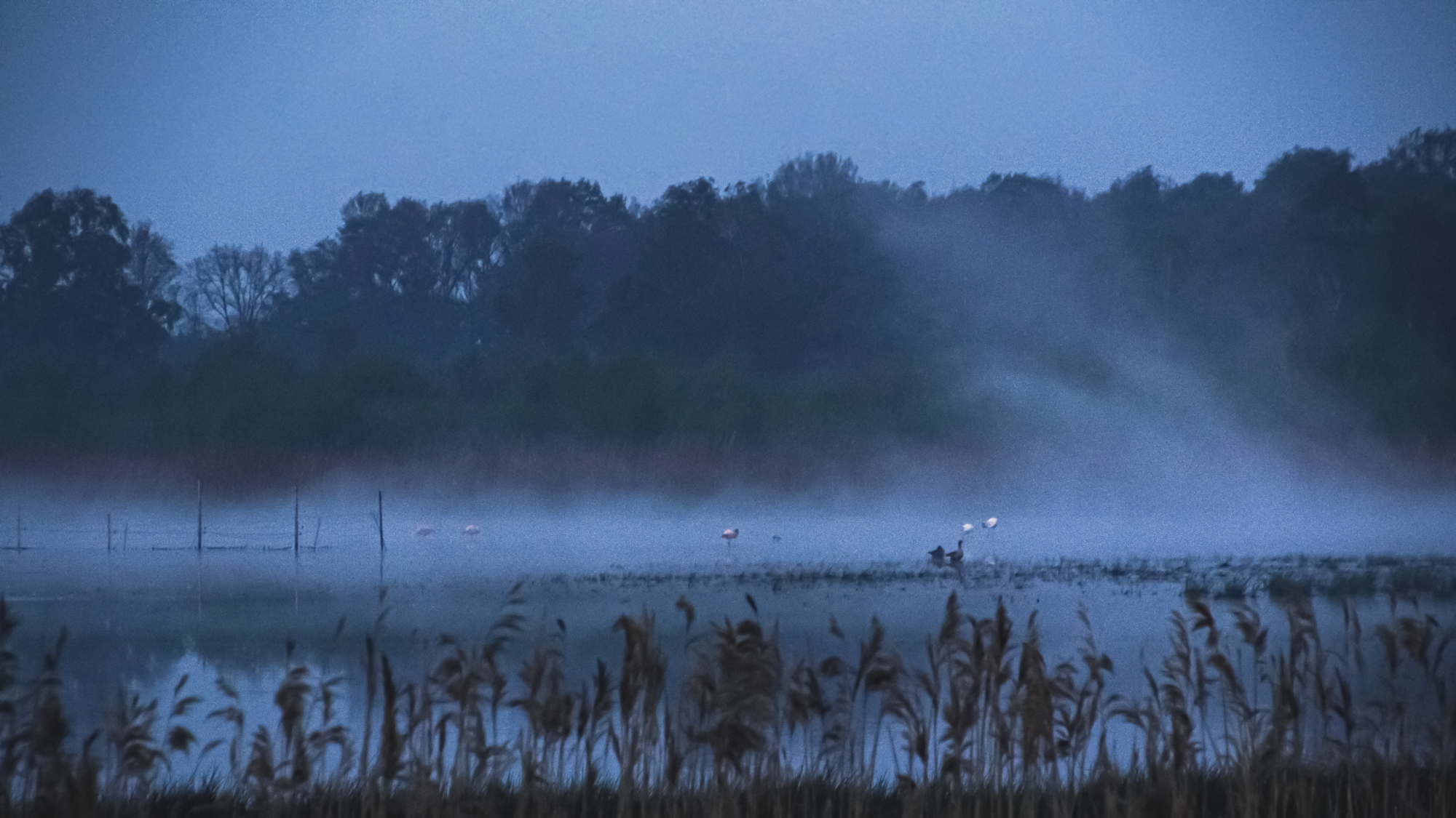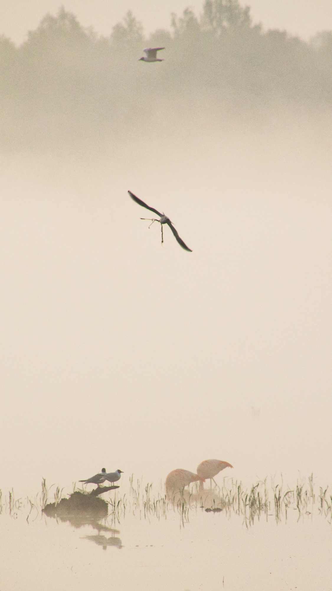 5 am in the morning and it is slowly turning bright enough to see. We can hear the loud calls of the birds long before we are able to see them. The cool fresh air feels good after the two hour drive up north. White mist drifts upon the lake wrapping around the flamingos.